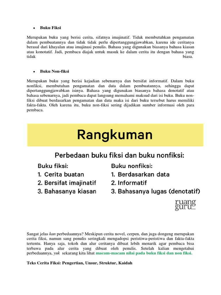 Cermati penggalan teks berikut untuk menjawab soal! Untuk mengunduh file gunakan tombol download yang tersedia kemudian buka link download yang muncul. Pada kesempatan ini, soal meminta kita untuk menyajikan unsur buku fiksi dan nonfiksi. Buku fiksi adalah buku yang berisi cerita atau kejadian yang tidak sebenarnya. Buku jenis ini menonjolkan imajinasi pada sumber inspirasi, buku non fiksi justru sebaliknya. Sedangkan buku nonfiksi merupakan buku yang isinya merujuk pada data serta fakta yang berlaku pada kehidupan nyata dan memiliki sumber literature yang jelas. Contoh buku non fiksi adalah buku ajar buku pelajaran biografi buku ajar buku jurnal dll. Dewi lestari (dee) tebal buku: Literasi buku fiksi dan non fiksi buku fiksi adalah buku yang berisi cerita atau kejadian yang tidak sebenarnya. Apa judul buku yang kamu baca? Beriku tkakak akan mencoba menjawab pertanyaan tersebut. Perbedaan keduanya sebenarnya sangat jelas ketara dan mudah dibedakan. Buku ini hadir sebagai solusi jitu dan komplit.